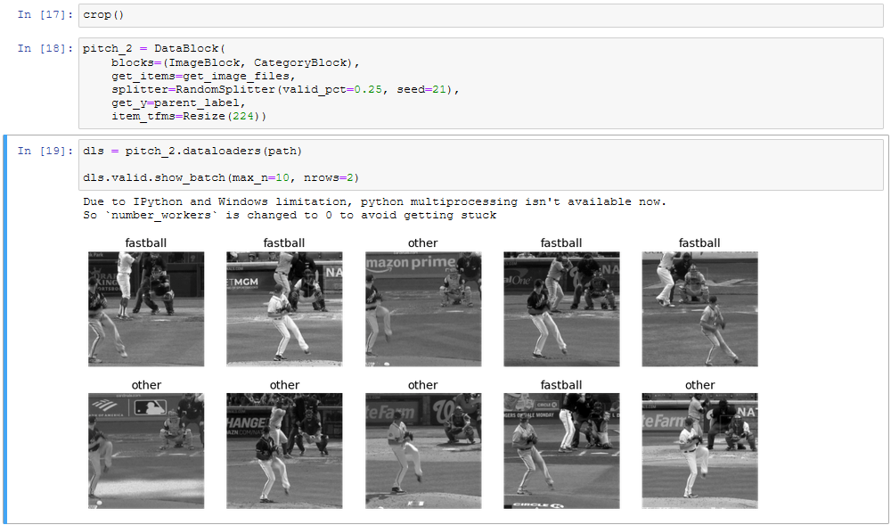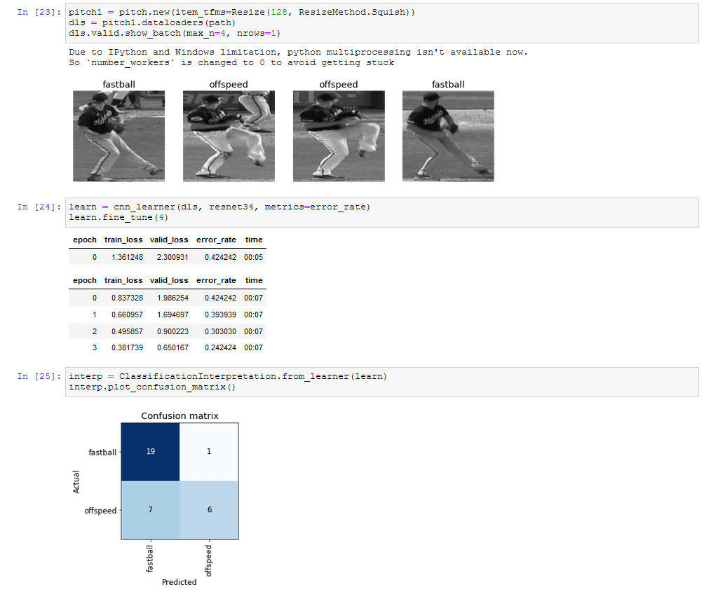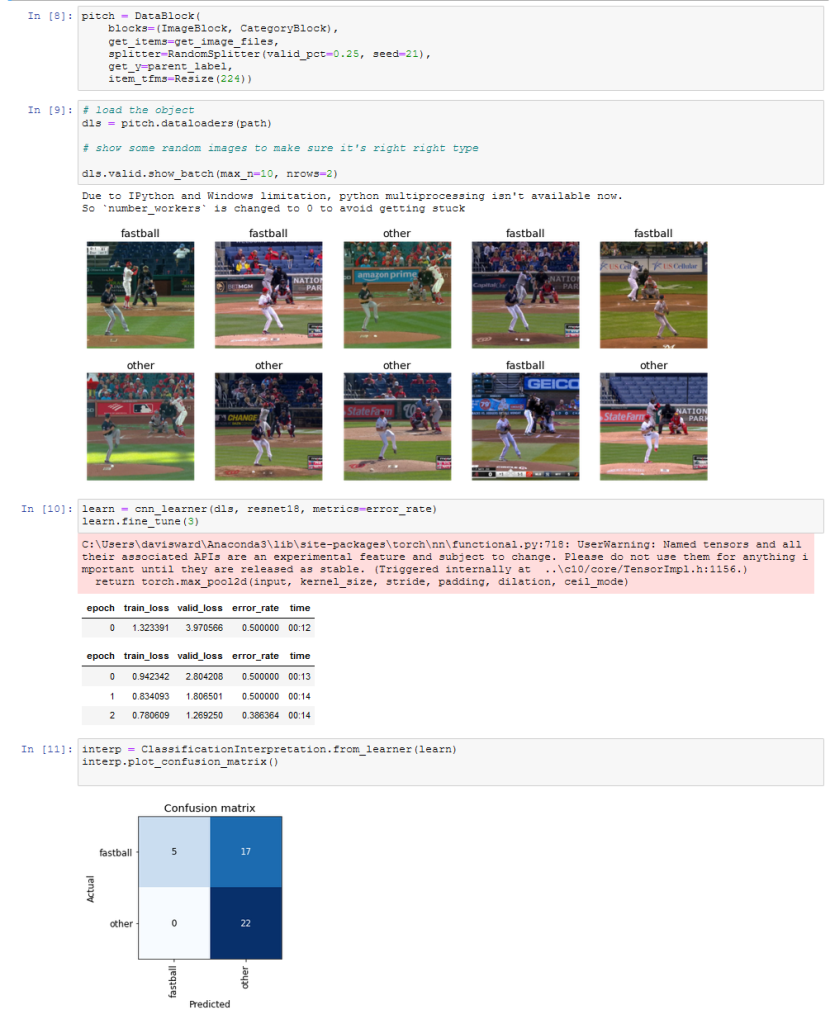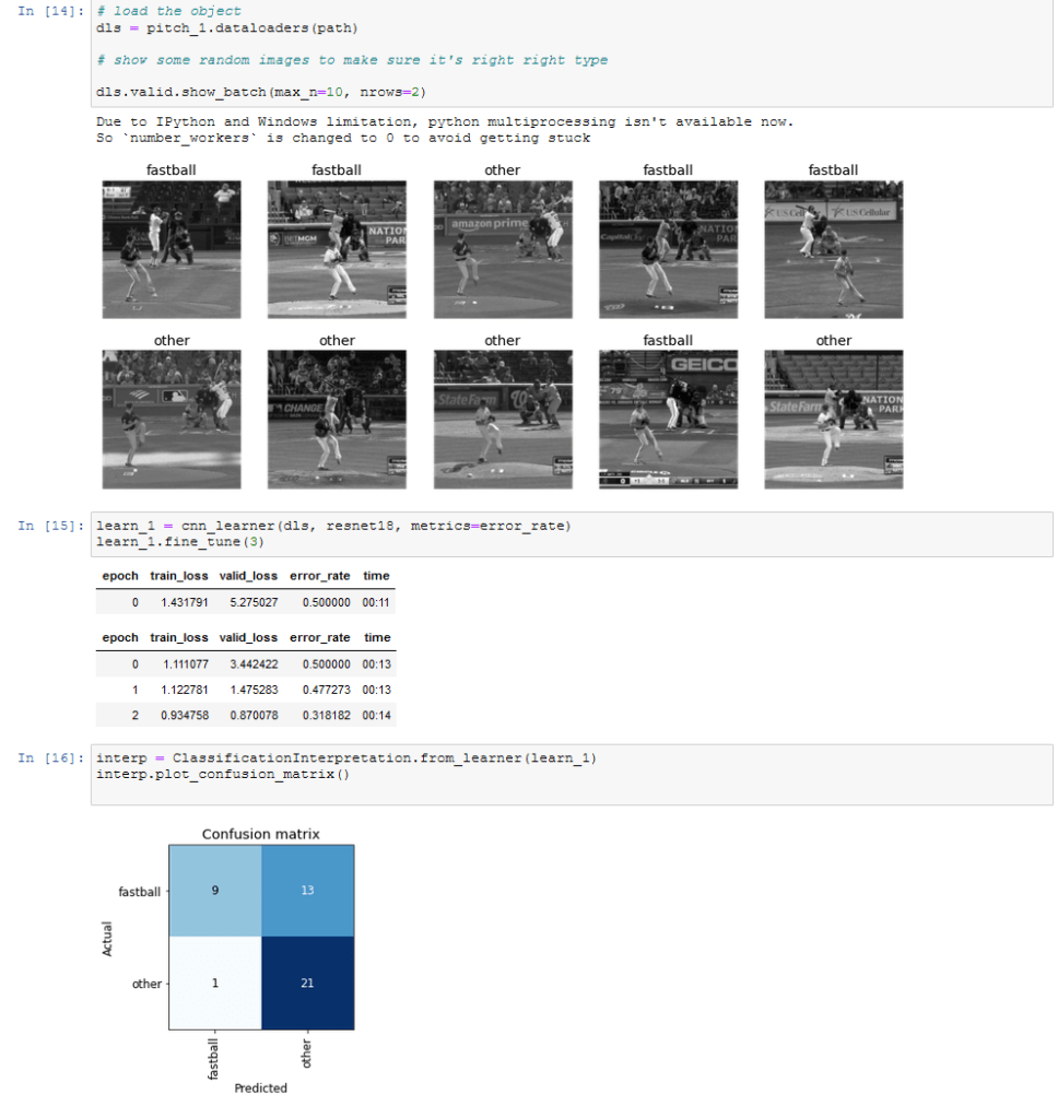 From there I loaded ran the fastai model again with the cropped and greyed images of fastball/nonfastball.