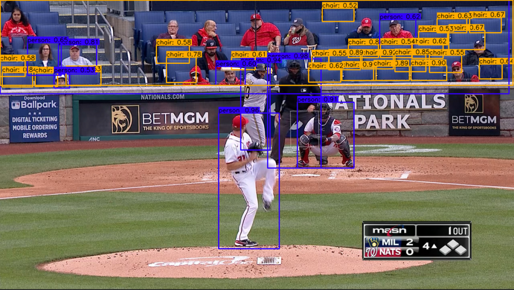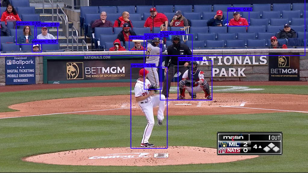 Next I turned up the score needed for the model to detect an object. The confidence which it needs by default to classify an object is about 50%. For the images I was going to use, the ‘person’ it would identify as the pitcher would be above that confidence.