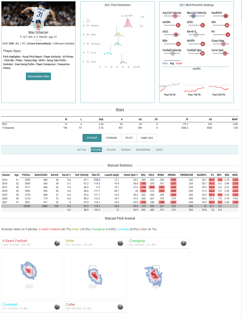 For the limited scope of testing this hypothesis, I was going to limit myself to analyzing just one pitcher. The time needed to gather the image data meant I had to have a small scope, and the model will only be effective at analyzing and predicting based on a single pitchers tendencies so I chose Max Scherzer. I landed on him for a couple of reasons; personally I am biased towards him as a fan, he is a recognizable pitcher, and he throws 5 pitches with a good speed mix (4 seam fastball, cutter, slider, changeup, curveball) and a good usage mix which meant I was going to have a more diverse image data set than if I had chosen someone with a small pitch range.